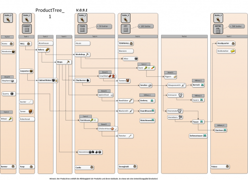 Diese Produkthierarchie ist nicht vollständig und bezieht sich nur auf die Gebäude für die ein Bauplan vorhanden ist, da diese Gebäude und Rezepte vorhanden sein müssen, damit das System überhaupt funktioniert.